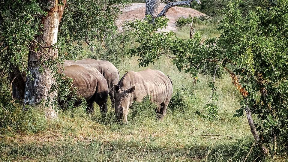 Gegen Mittag legten wir eine kleine Pause ein und bereiteten gemeinsam mit unserem Guide Justice ein Mittagessen an einem Rastplatz zu. Die Rastplätze im Krüger Nationalpark sind alle eingezäunt und vor wilden Tieren gesichert, so dass man sich hier frei bewegen kann. Eine Pause tat auch unseren Augen ganz gut, die schon ganz müde waren vom ganzen Suchen und Aussicht halten. Nach der Stärkung ließen die nächsten Wildtiere nicht lange auf sich warten. Mit dabei, waren sogar wieder Mitglieder der Big 5 – Nashörner! Diese großen Geschöpfe sollen zwar nicht ungefährlich sein, machten aber einen unglaublich friedlichen Eindruck mit ihren sympathischen Augen und kleinen pinseligen Öhrchen.