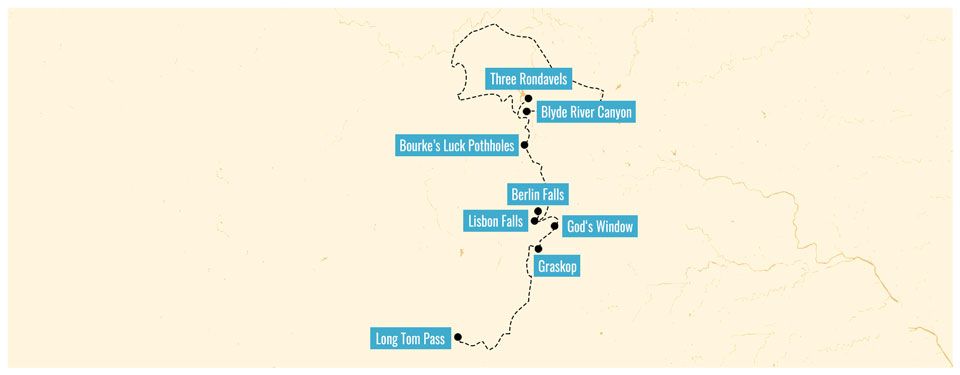 Der schönste Teil der Panorama Route startet in Graskop. Von hier aus führt euch die R532 zu den schönsten Highlights und Aussichtspunkten. Hier sind die Landschaften geprägt von Wasserfällen, steilen Abhängen, saftig grüne Landschaften und hohen Bergen.