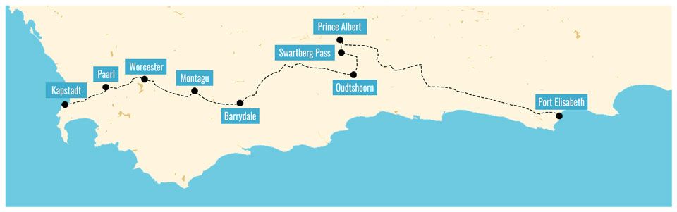 Über Barrydale, Ladismith und Calitzdorp erreicht man nach etwa 350 km die Stadt der Strauße – Oudtshoorn. Weiter führt die Route dann über den Swartberg Pass nach Prince Albert. Östlich von Oudtshoorn wird die Landschaft dann immer spärlicher besiedelt, bevor man in der Nähe von Jeffreys Bay die Küste der östlichen Garden Route erreicht.
